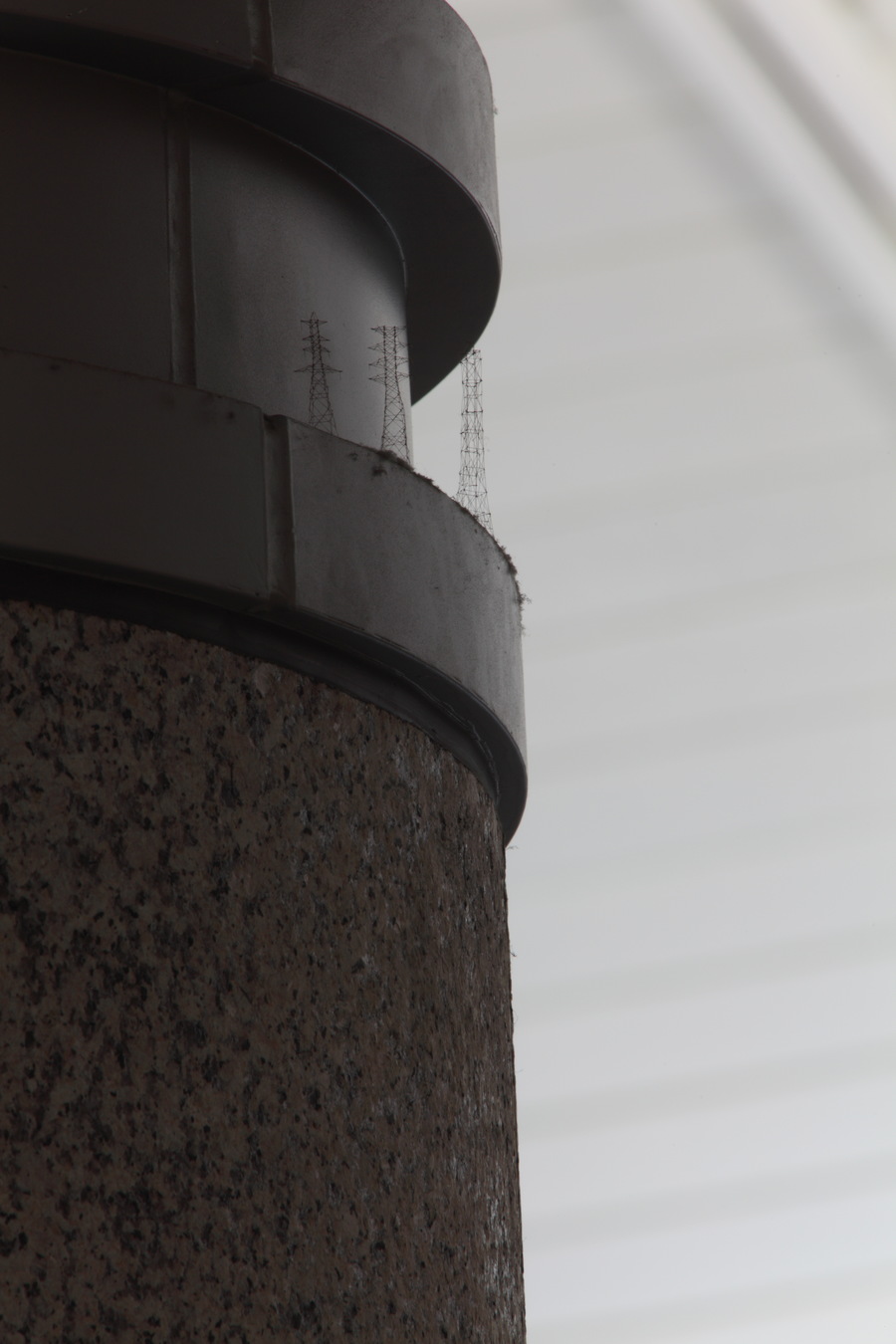 展示室の間の廊下に置いてある望遠鏡をのぞくと、どこか遠くの鉄塔が目に入ってきます。あまり人が通らない場所なのか、ホコリもたまっているようです。これは、岩崎貴宏が、自分の髪の毛を素材に作った、小さな鉄塔のかたちをした作品です。「夜ノ森よのもり線」とは、東日本大震災の津波によって、福島の原子力発電所が非常停止したとき、原子炉を冷却するための電力を送るはずだった送電線の名前です。ここにある3本の鉄塔のうち、真ん中の「夜ノ森線No.27鉄塔」が倒壊したことで、原子炉はコントロールできなくなってしまいました。ホコリだらけで普段は気づかない、忘れられそうな場所にある大事なものの存在を、今一度考えてみようとする作品です。 (木村絵理子)