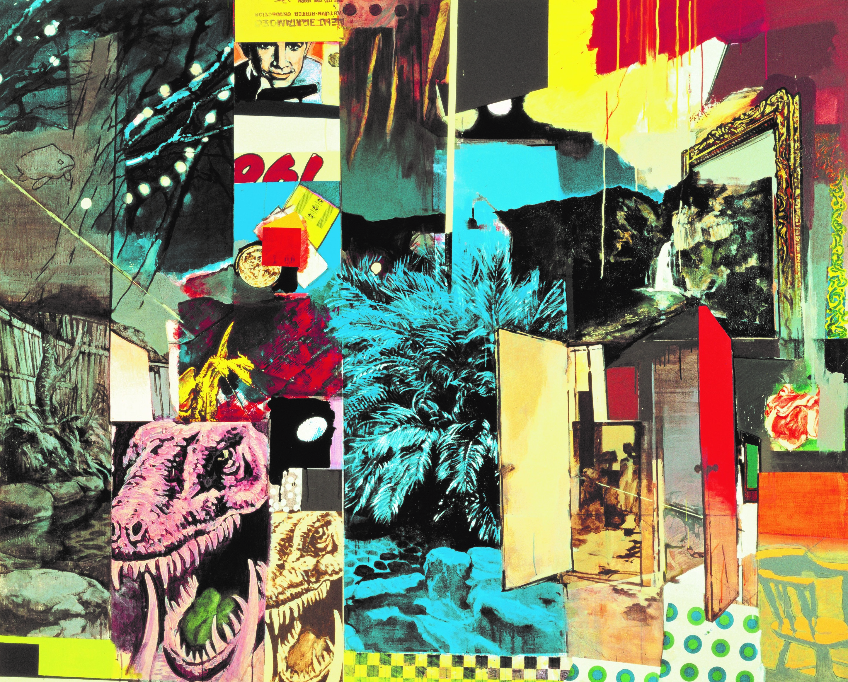 牙をむくティラノサウルスや映画「007」シリーズのジェームズ・ボンドと思しき断片が目をひきます。額縁からは山や滝の雄大な風景が流れ出ているかと思えば、手前には庭園の池が切れ切れに描かれ、右下には百貨店の包装紙が貼り込まれているようです。ここでは、時間や空間、現実と虚構を超えた雑多なイメージが、切り取られ、寄せ集められているのです。自分の絵を「絵画について提案する装置」であるという作家は、この絵の中で、ひとつの物語や風景を描くための絵画の伝統的なルールから解き放たれ、それらを大胆に覆くつがえそうと試みているようです。福田はこの作品によって、具象画家の登竜門である安井賞を歴代最年少の26歳で受賞しました。(片多祐子)