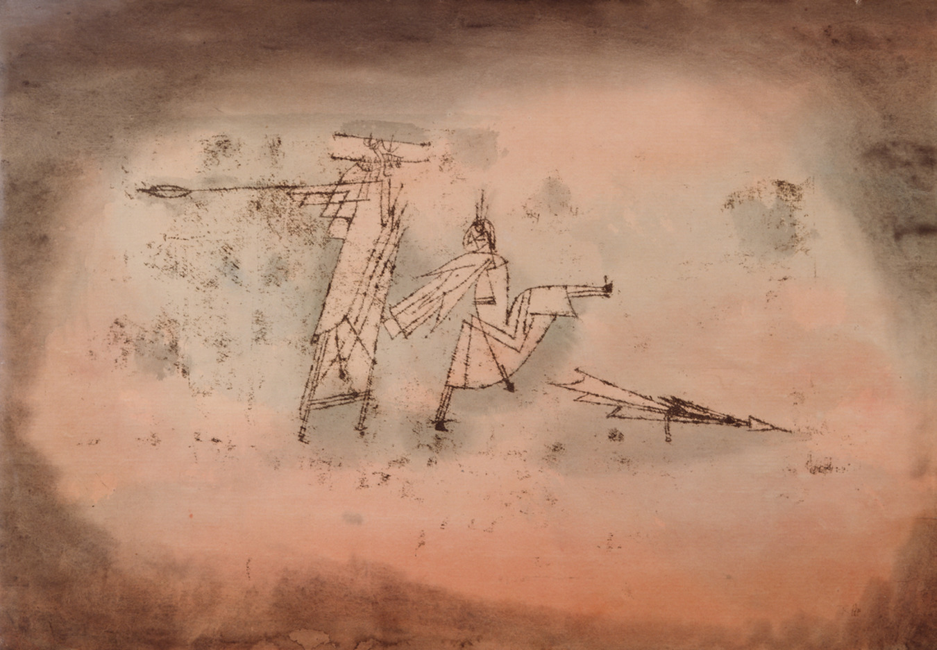 人の姿を思わせるみっつのかたち。原画に描かれた線をなぞって別の紙に写しとる、クレー考案の「油彩転写」技法を用いた作品です。 クレーは生涯に300点を超える油彩転写作品を残しています。この技法を用いて写しとった線には、直接描いた線とは違う、ごつごつとした独特の味わいがあります。また、ところどころに見られる「むら」は、写しとる際の手の圧力や紙のこすれによって生まれたものです。偶然の力も利用したこの油彩転写には、あらゆる手をつかって「線」の表現を追求しようとするこの画家の姿勢が見てとれるでしょう。(松永真太郎)