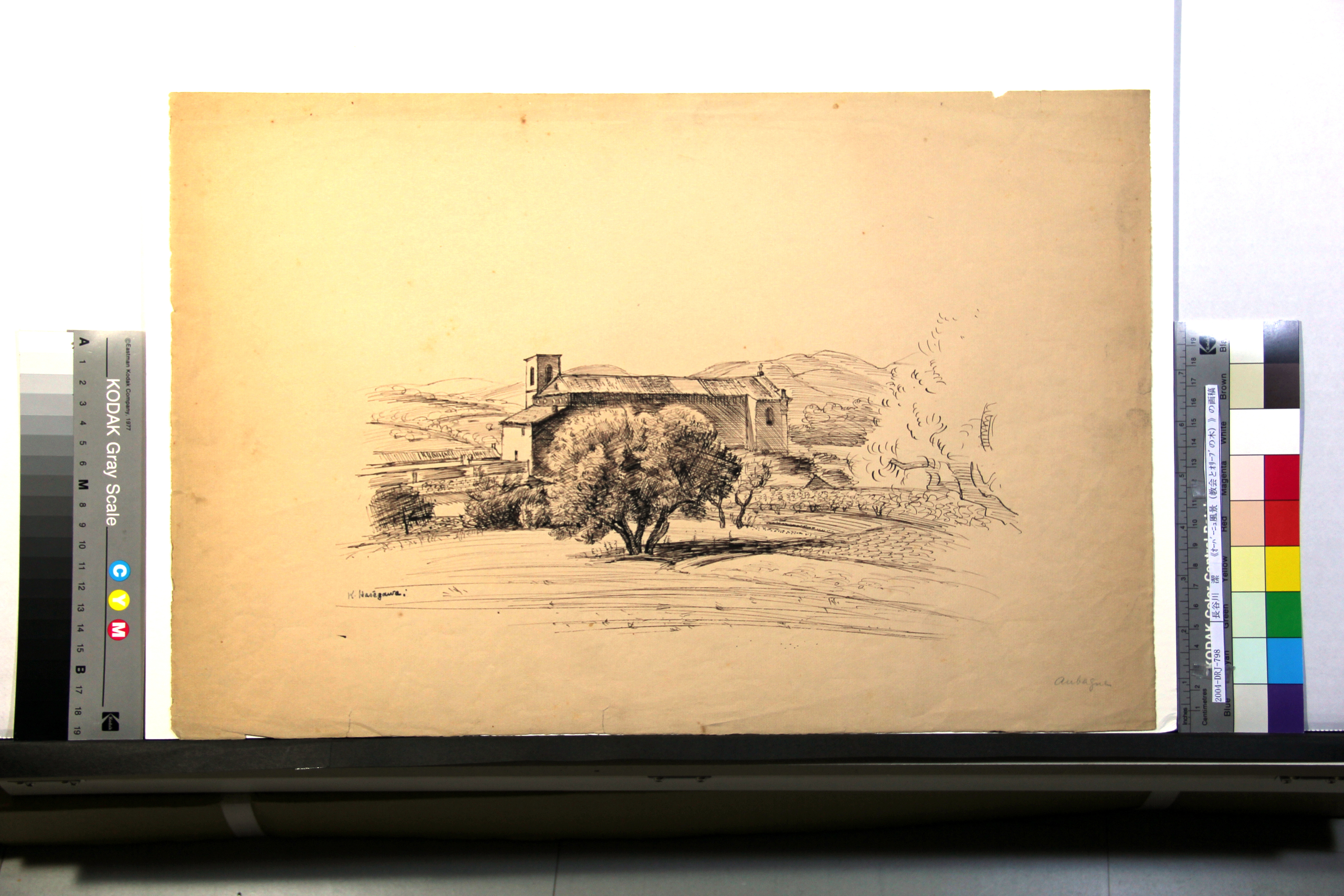 《オーバーニュ風景(教会とオリーブの木)》の画稿