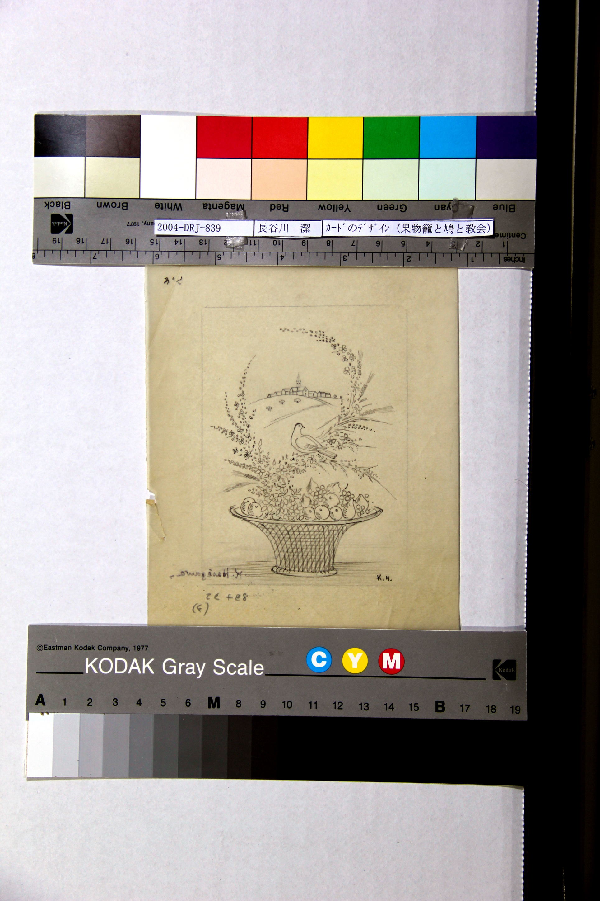 カードのデザイン(果物籠と鳩と教会) 画像 拡大する
