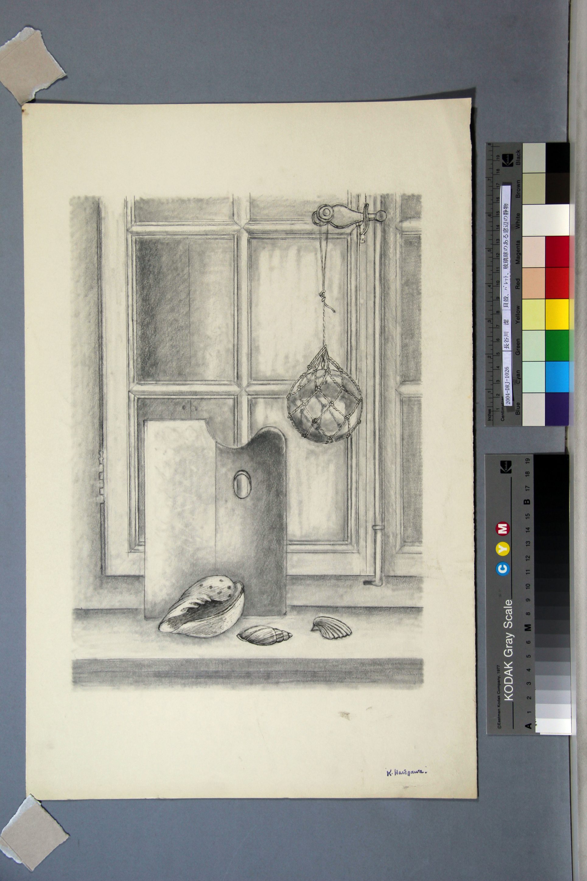 貝殻、パレット、玻璃球のある窓辺の静物 画像 拡大する