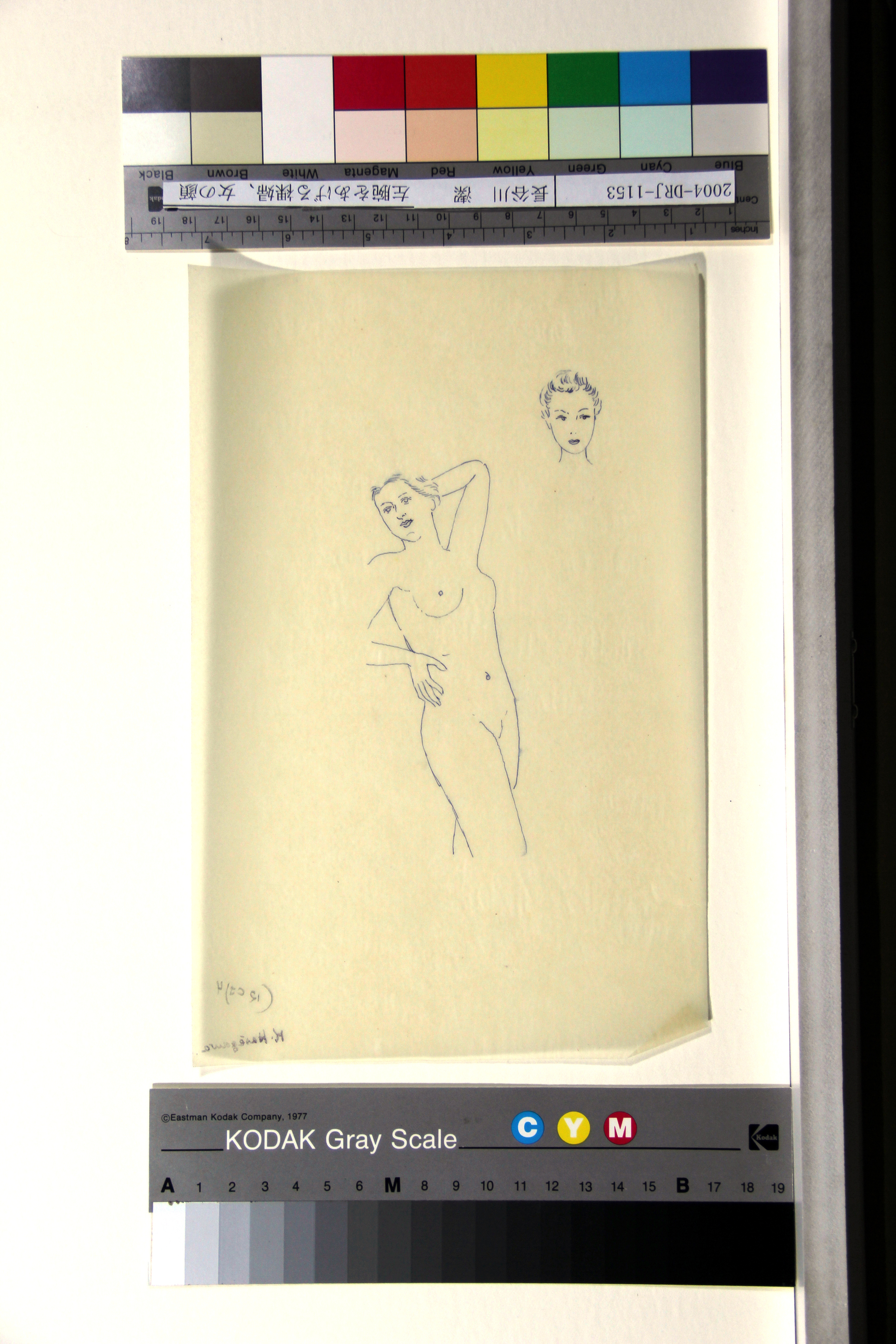 左腕をあげる裸婦、女の顔