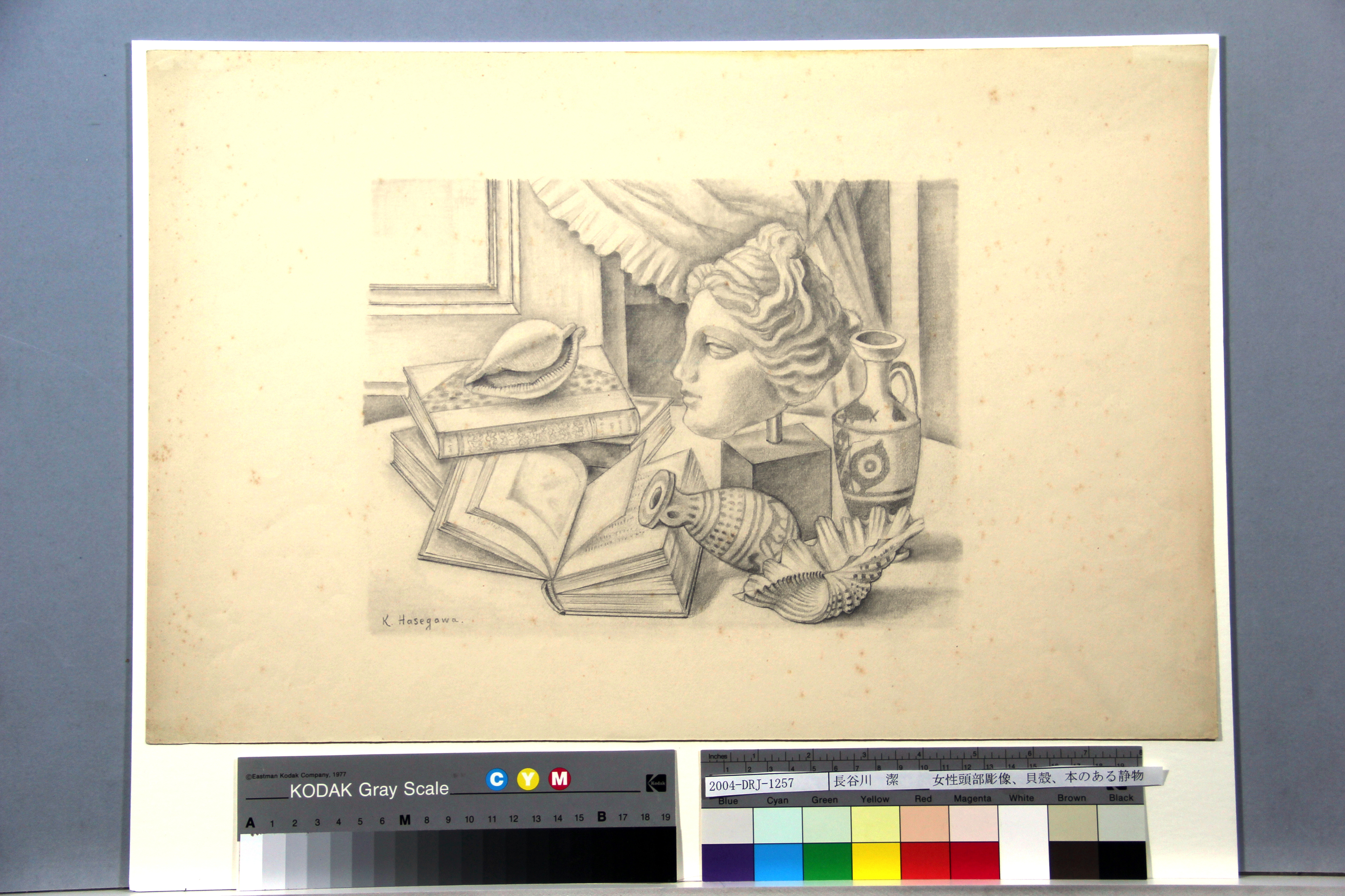 女性頭部彫像、貝殻、本のある静物 画像 拡大する