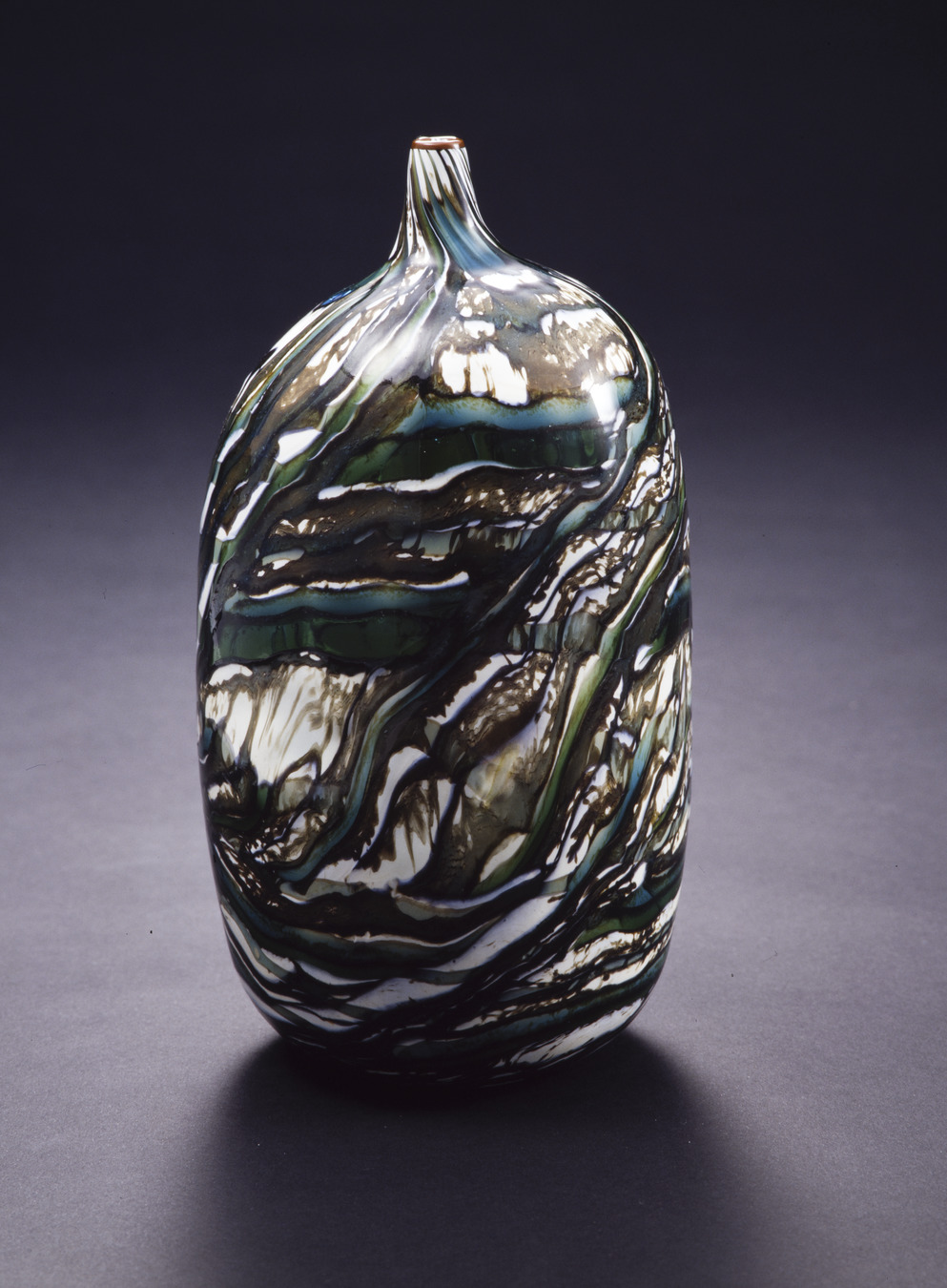 The work, which is distinguished by its vivid combination of colors, is titled Laguna, meaning "lagoon" in Italian. For artist Ohira Yoichi, the title is a reference to the lagoons of Venice, the "floating city" of the Adriatic, where he worked for 37 years from 1973. Perhaps the combination of colors expresses the city’s alleys and lagoons, sea and sun, woven together with light and shade. The work is made using traditional mosaic techniques. Glass rods of different colors are sliced and arranged, then covered with glass powder to form a mass that is later shaped using a blowpipe. Wave-like irregularities are also added to the surface. Several craftsmen collaborated to create this piece under Ohira’s direction. (HASEGAWA Tamao)